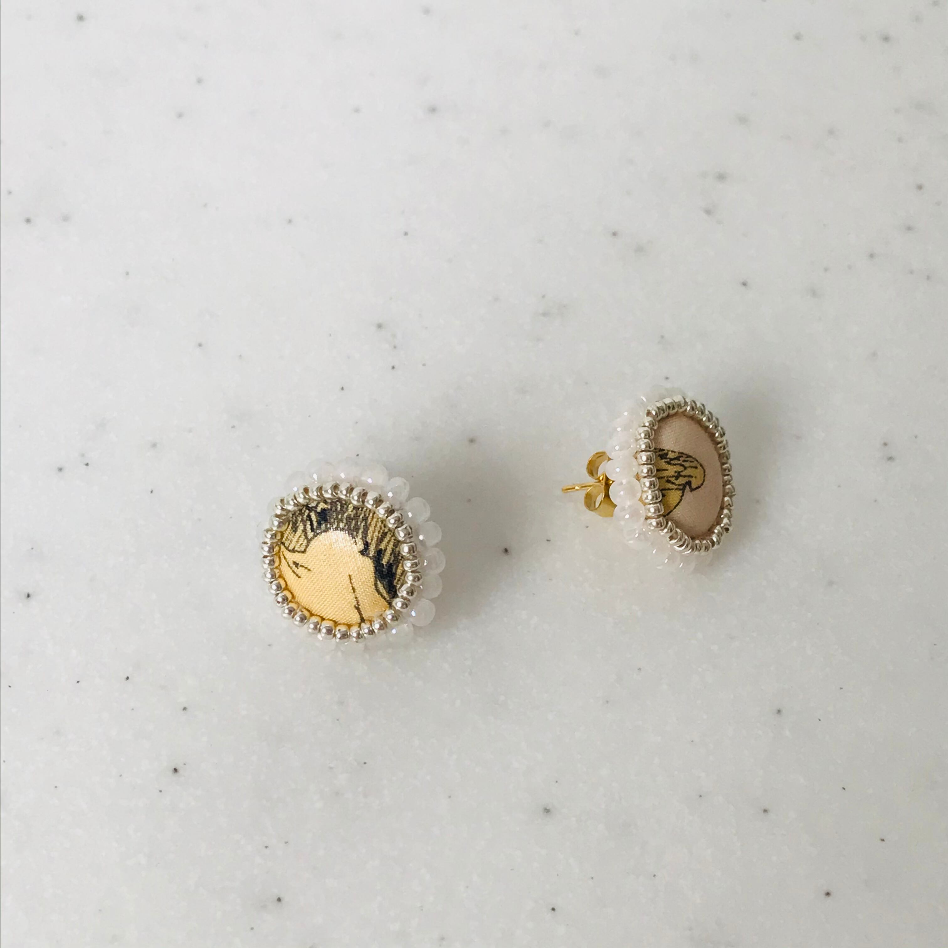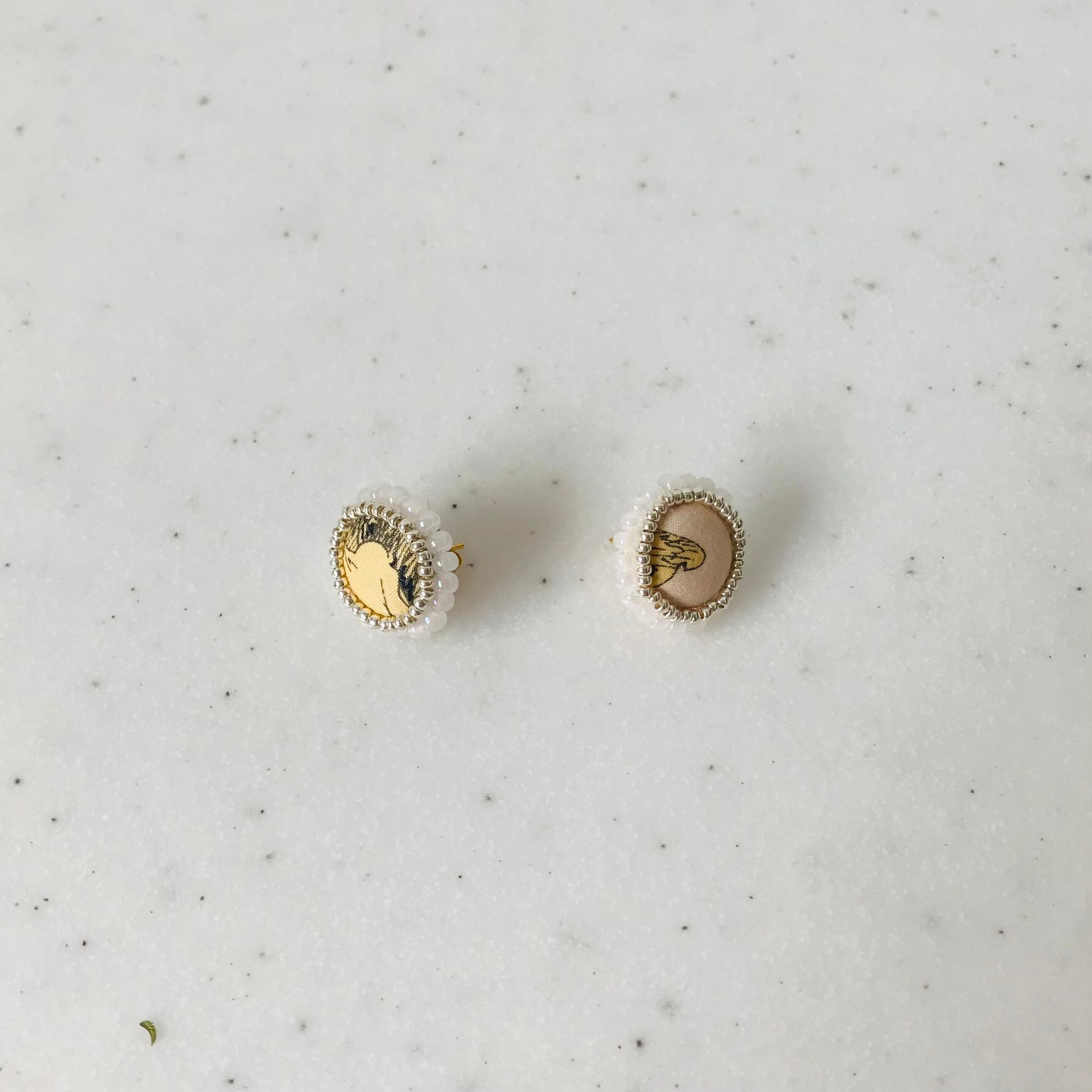 ◇ピアス、イヤリングはファブリックを使用したクルミボタンでアクセサリーを作成しています。