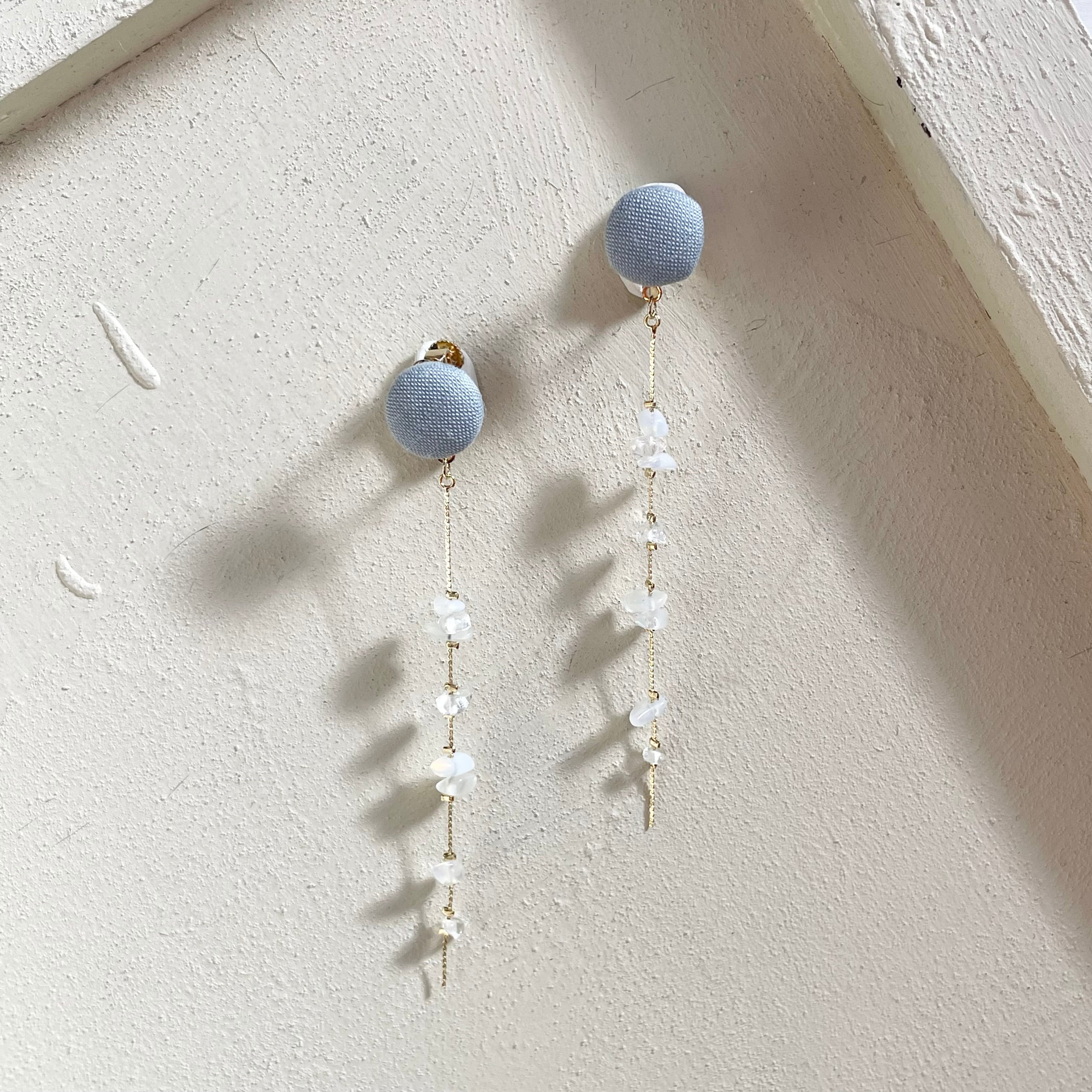 爽やかなアイスブルーのクルミボタンに雪解けのような瑞々しいクリスタルとホワイトオパールを組み合わせたアイテム。