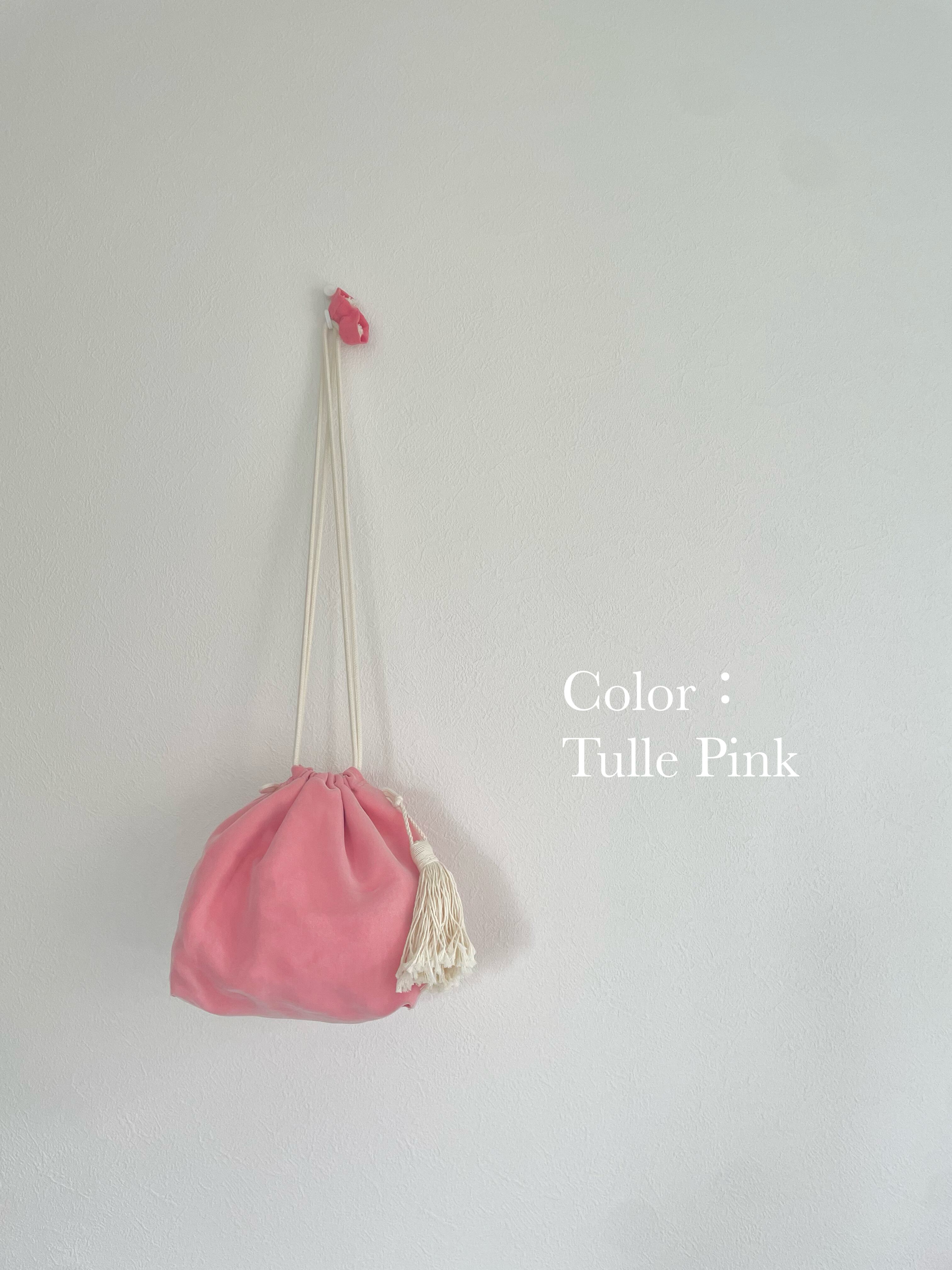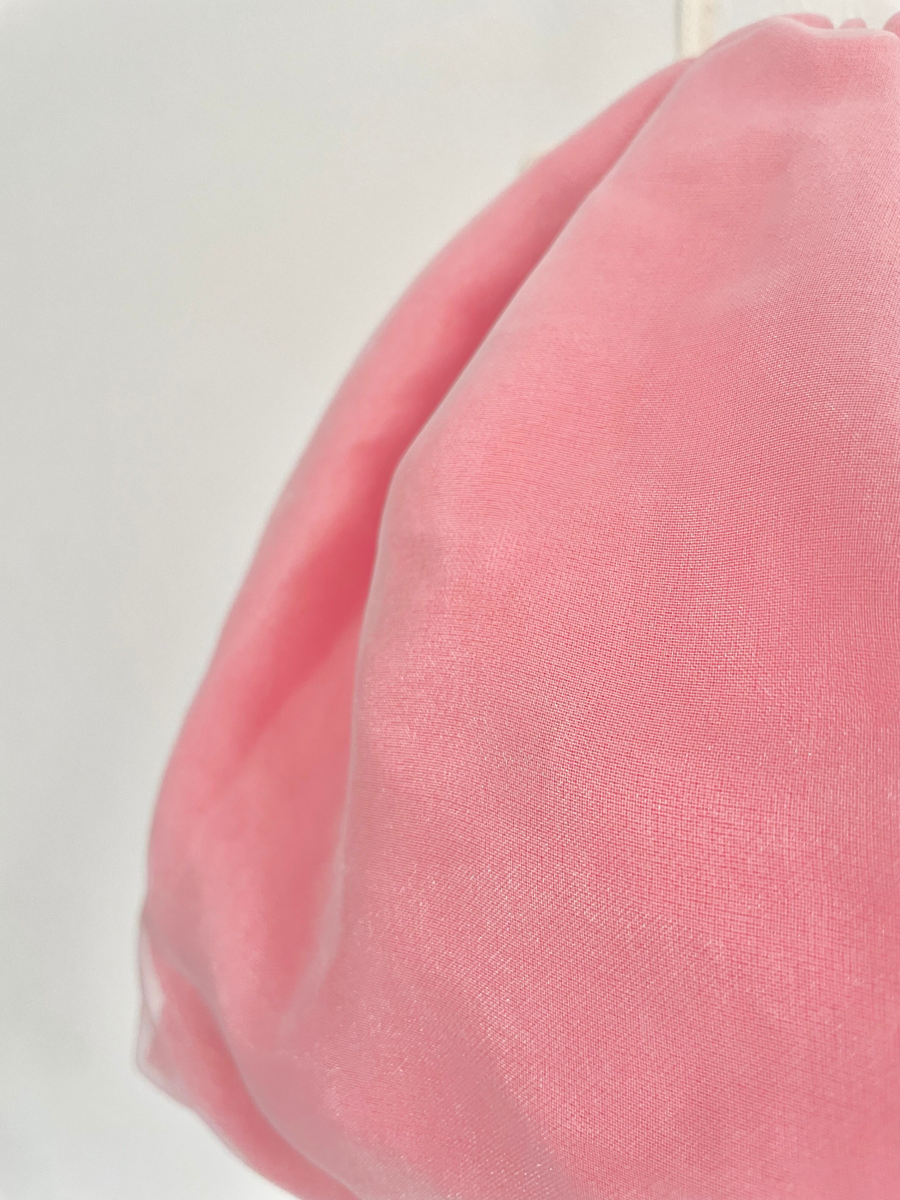 ビビットなピーチピンクカラーのファブリックの上から透け感のあるチュールを重ねています。