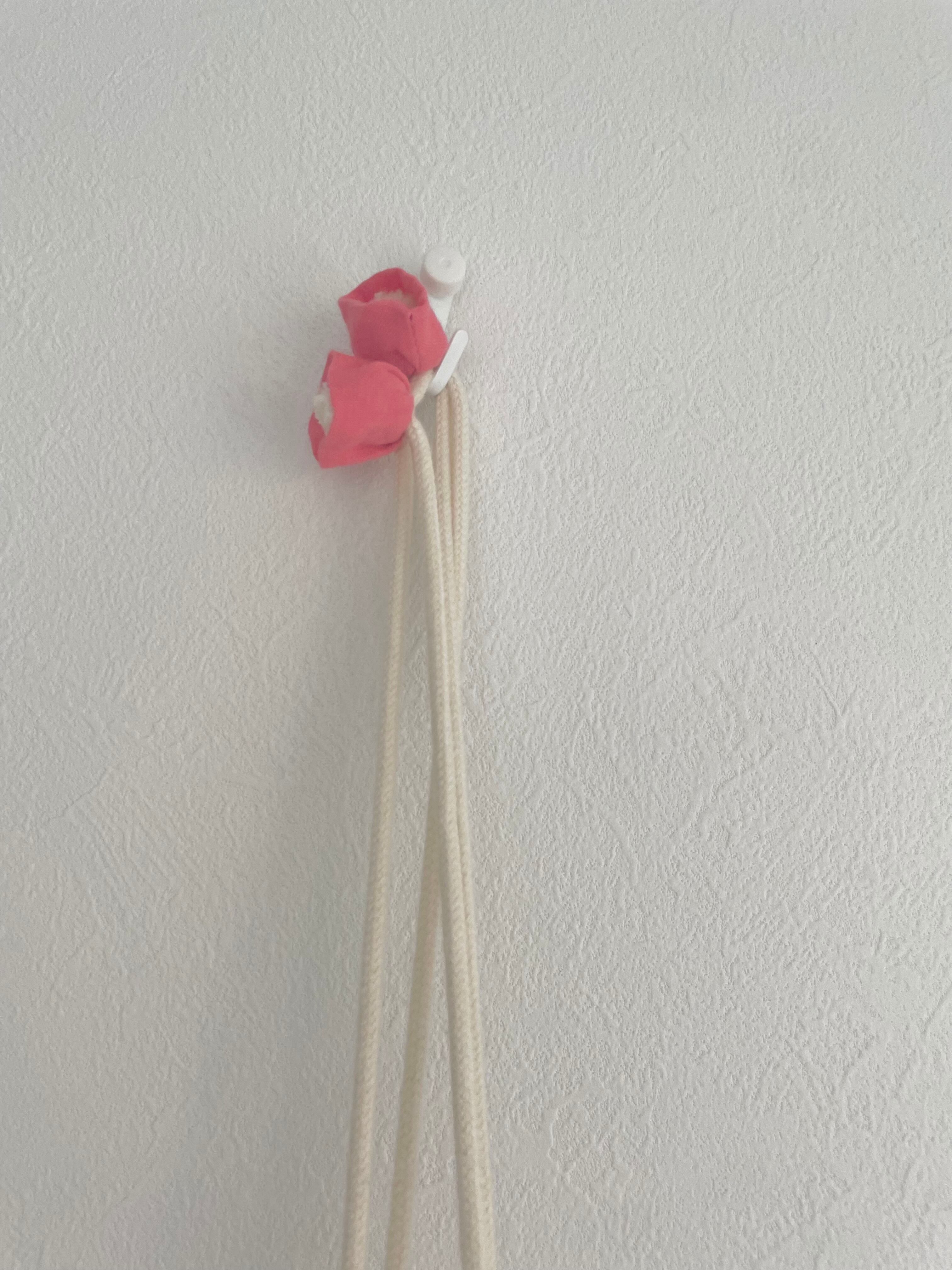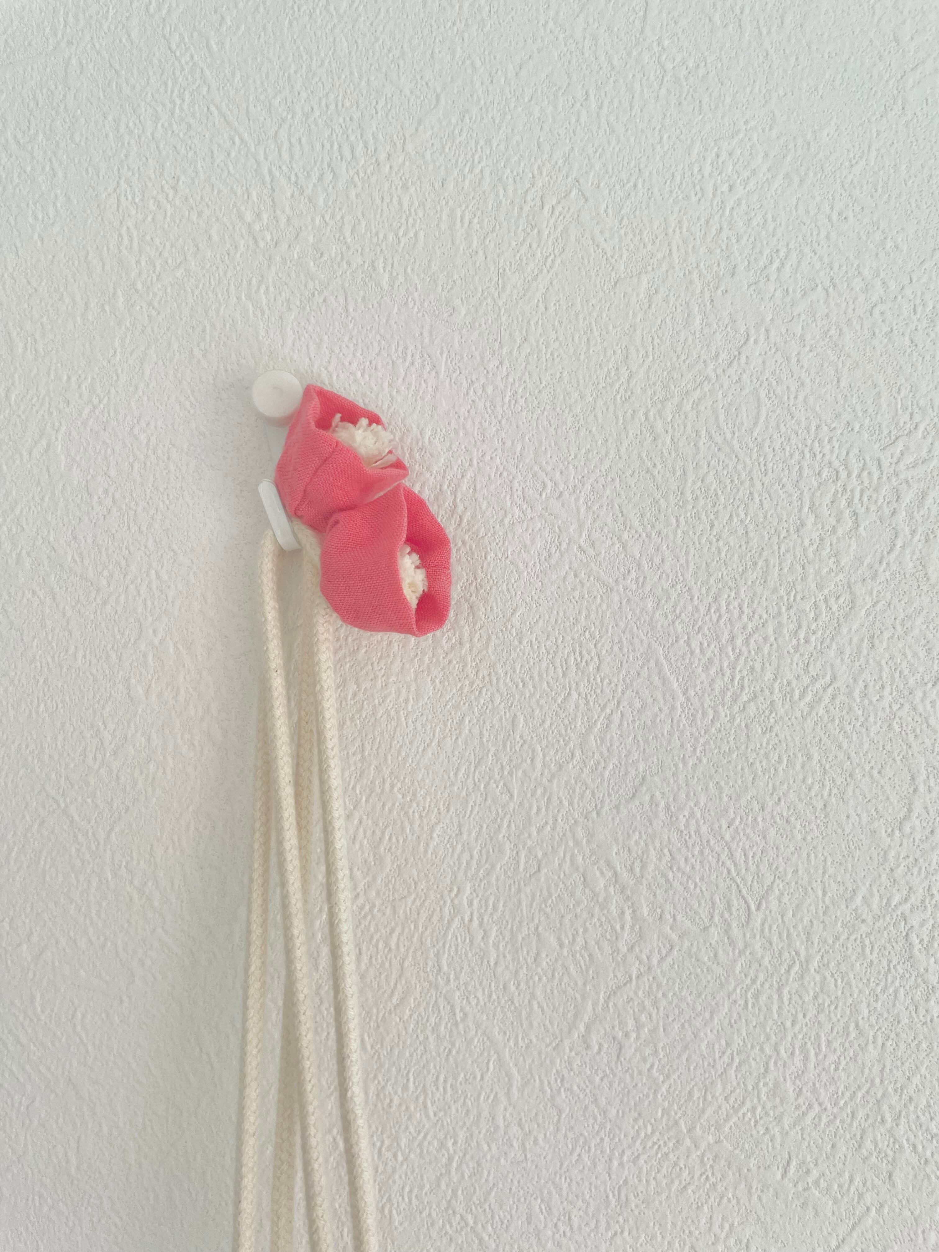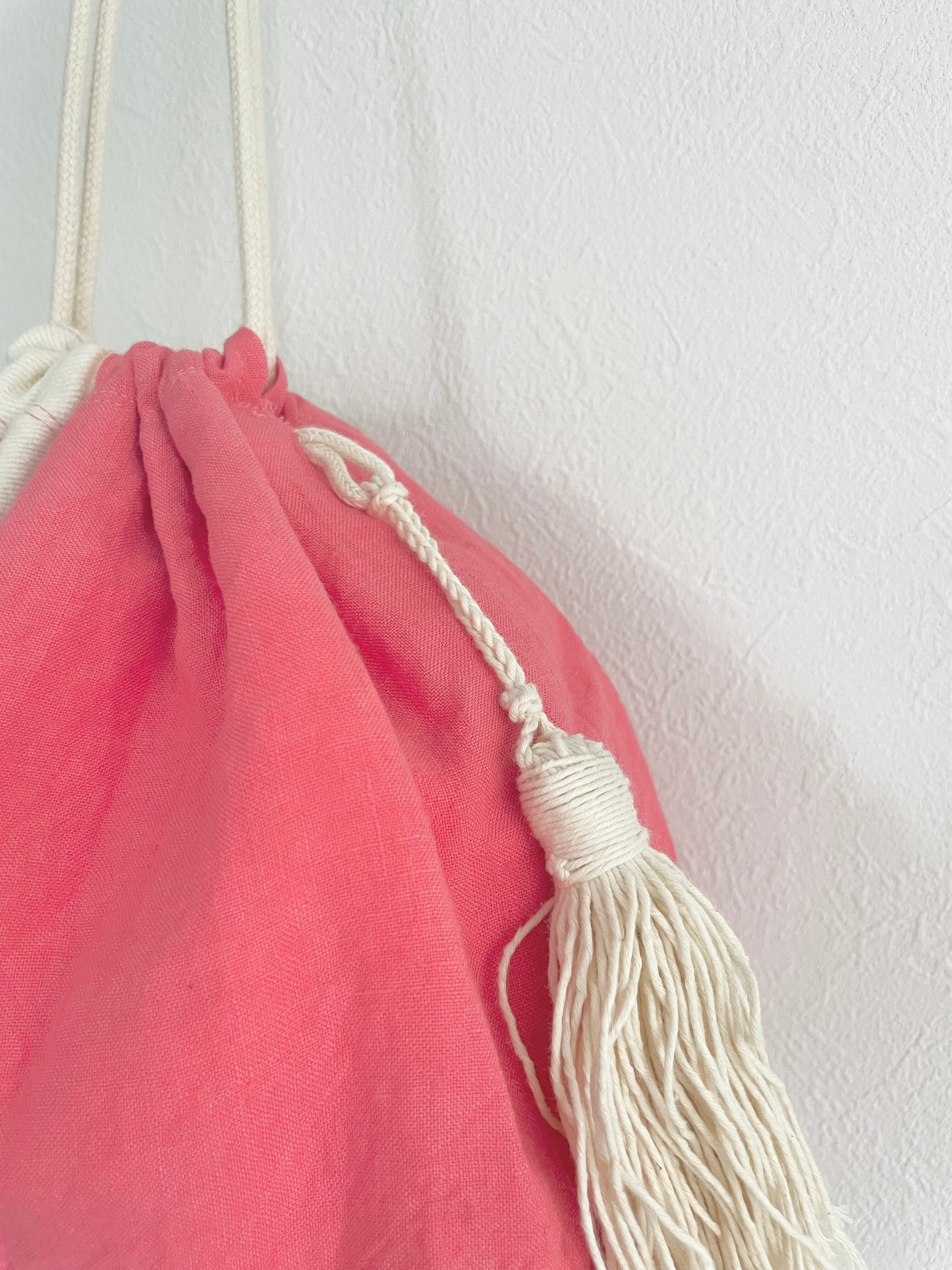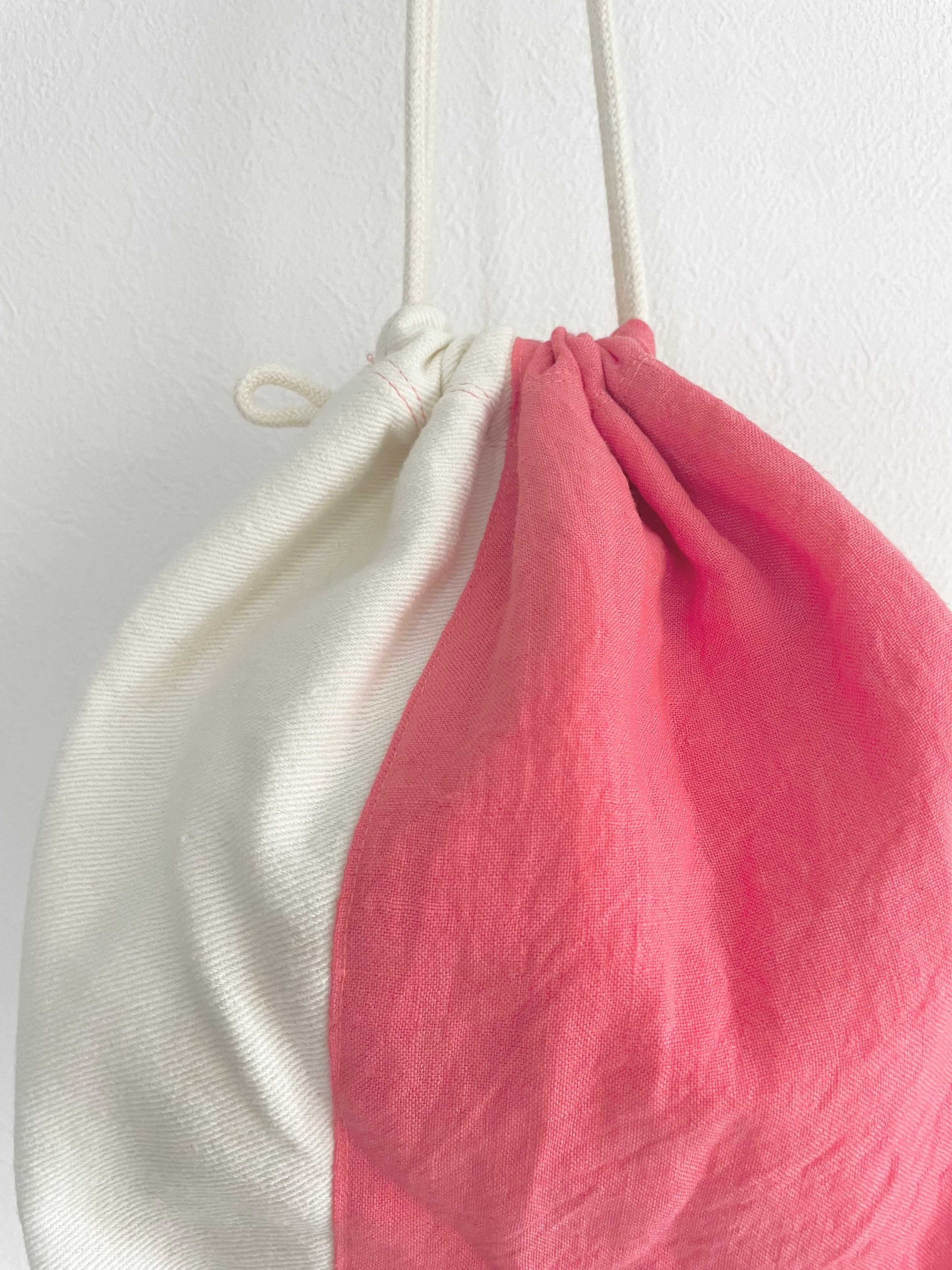 ビビットなピーチピンクカラーとオフホワイトのファブリックを組み合わせています。